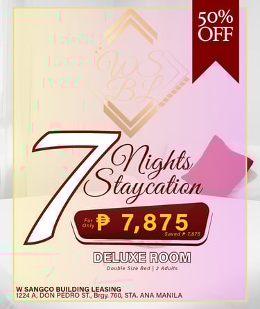Avail of exclusive discounts for straight consecutive staycations at WSBL Pension Inn. Discounts apply per room and are exclusive – no stacking with other promotions (e.g., senior citizen or PWD discounts).