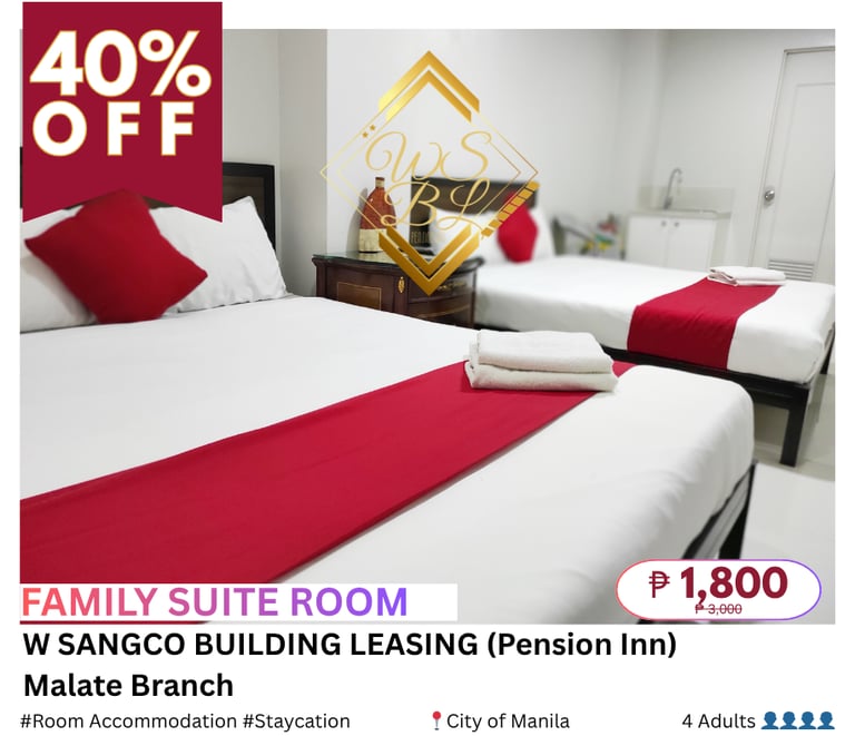 W Sangco Building Leasing (Pension Inn) blends budget-friendly rates with undeniable comforts in Manila's most vibrant district. Perfect for business travelers, sweet couples, families, groups, and tourists seeking value without compromise. Book now for exclusive online discounts!🌟